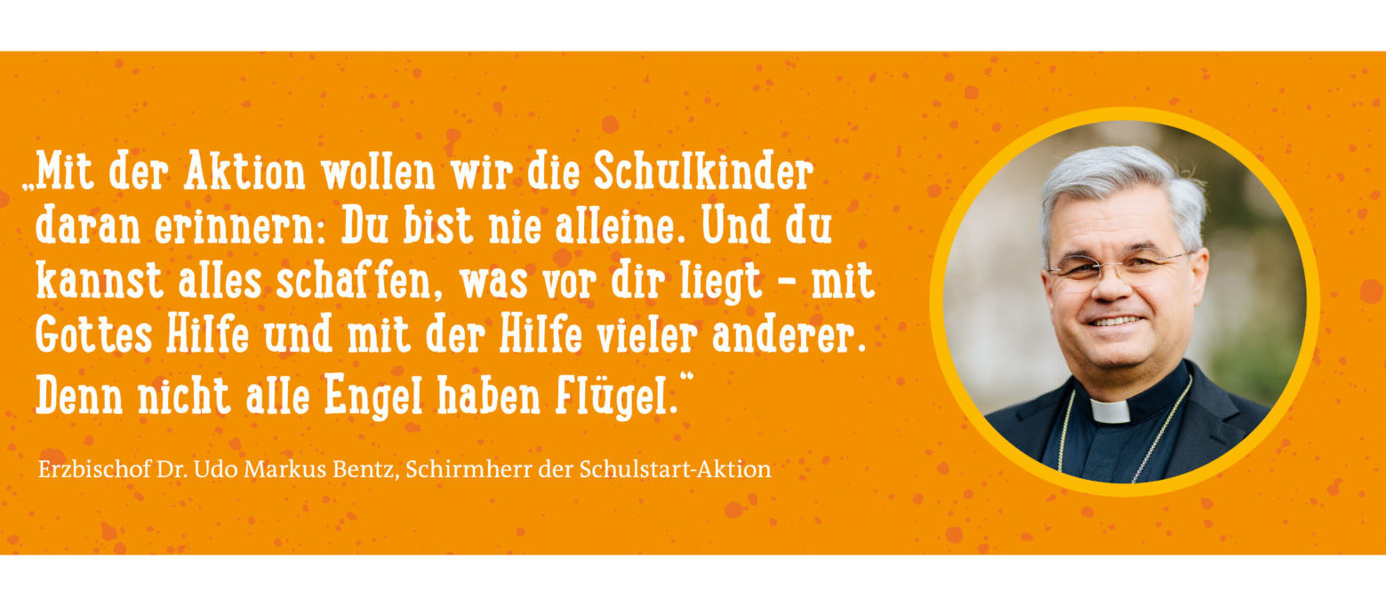 Ein Schulkind zu werden, ist spannend, kann aber auch einschüchternd sein. Erstklässlerinnen und Erstklässler sollen durch die Aktion „Jedes Kind braucht einen Engel!“ Vertrauen lernen – zu sich selbst, in andere Menschen und in Gott. Das Logo der Schulstartaktion zeigt eine stilisierte Kinderfigur, umfangen von Flügeln in Form von Händen. Die Aktion steht unter dem Psalm 91,11: „Gott befiehlt seinen Engeln, dich zu behüten auf all deinen Wegen“. „Kinder stehen unter Gottes besonderem Schutz“, betont Schirmherr Erzbischof Dr. Bentz. „Es ist unsere Aufgabe, Kindern an den Schwellen ihres Lebens Gottes Segen mit auf den Weg zu geben.“ Das gelte auch für Eltern, für die mit dem Tag der Einschulung ihres Kindes ebenfalls ein neuer Lebensabschnitt beginne.
