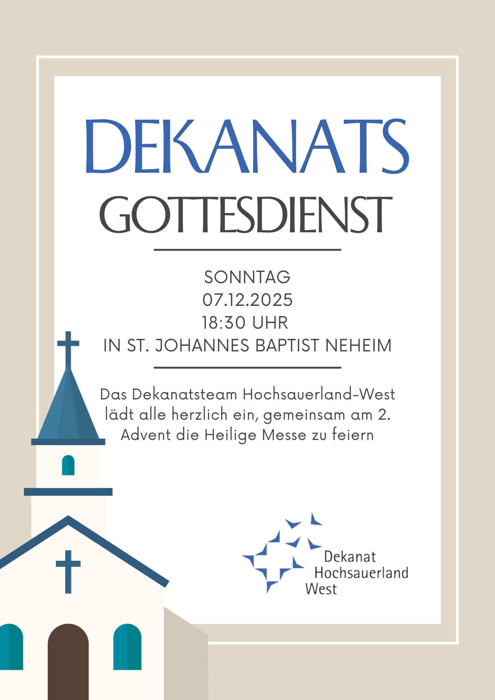 Dazu laden wir herzlich ein, am 07.12.2025 (2. Advent) um 18:30 Uhr gemeinsam in St. Johannes Baptist in Neheim die Heilige Messe zu feiern.