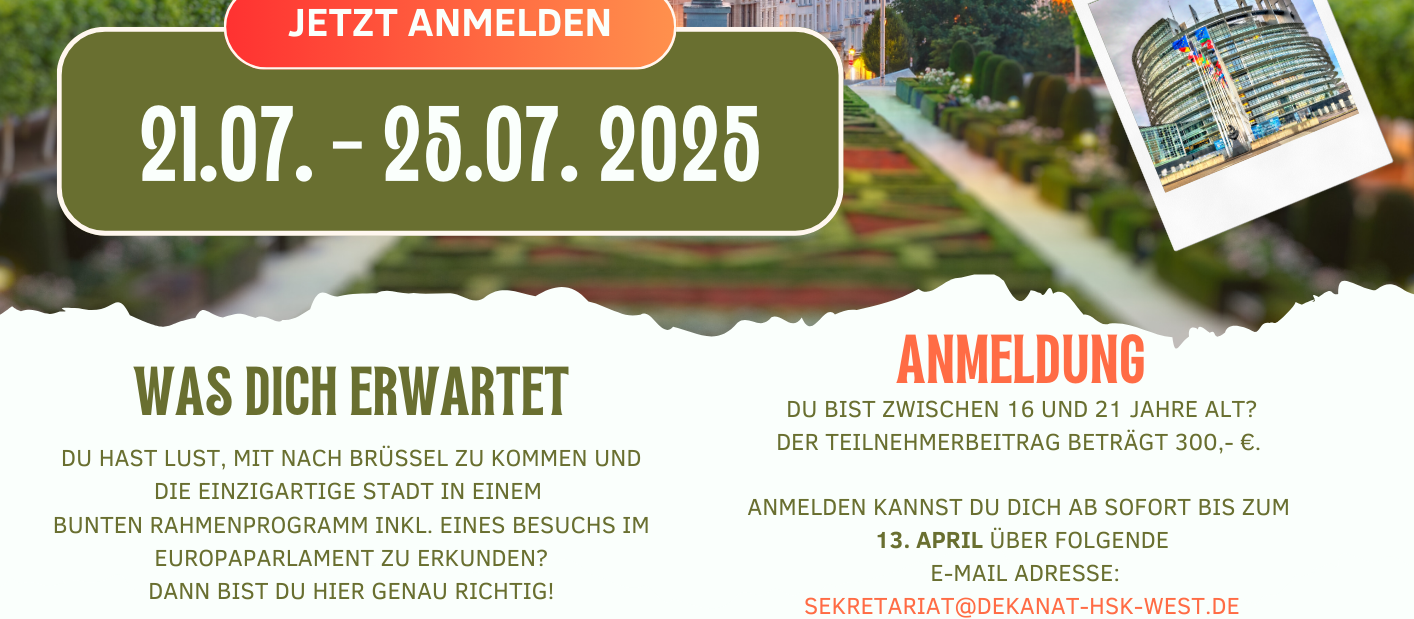 Du möchtest mit uns die einzigartige Stadt Brüssel erkunden und einmal hinter die Kulissen des Europaparlaments schauen? Dann melde dich bis zum 13. April über die E-Mailadresse: sekretariat@dekanat-hsk-west.de an.