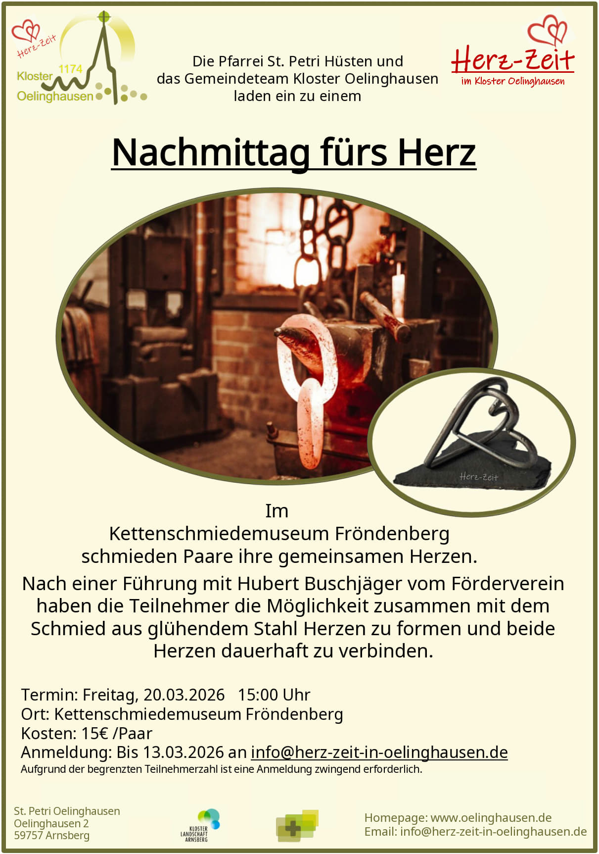 Die Pfarrgemeinde St. Petri Hüsten und das Gemeindeteam Kloster Oelinghausen laden im Rahmen der Herz-Zeit Veranstaltungen Paare zu einem Nachmittag fürs Herz in das Kettenschmiedemuseum in Fröndenberg ein. Dieses Mal möchten wir uns mit einem Symbol, nämlich dem Herzen, dem Thema Liebe und Partnerschaft widmen.